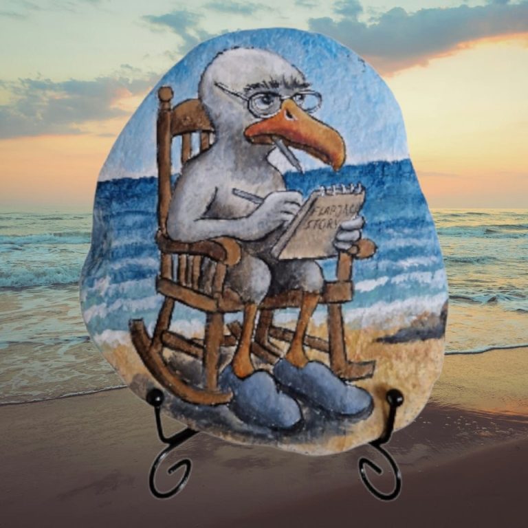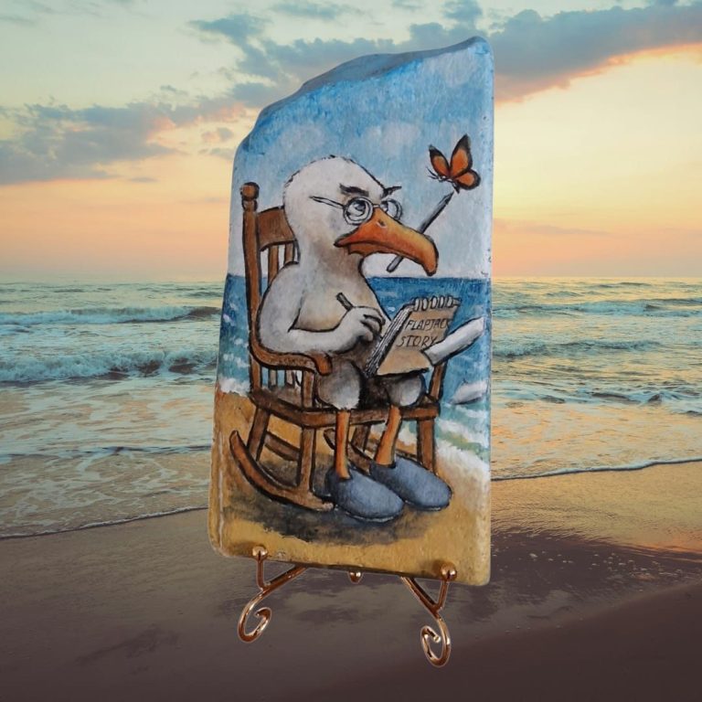 I was amazed to see the old seagull still sitting there, unmoved, still writing. The only difference was a butterfly that had landed on the end of his pen, which he seemed oblivious to. I captured this moment in another painting, finished later, which you can see here.