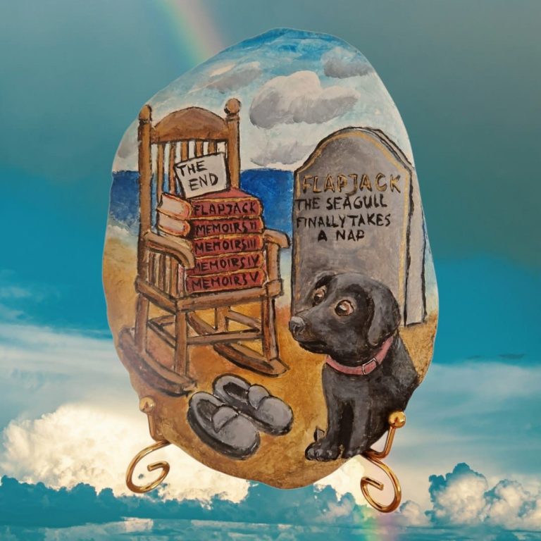 His large blue slippers sat in front of the chair, but there was no Flapjack in them. Five books were stacked neatly on the chair, marked Flapjack Memoirs I–V. A piece of paper on top simply read THE END. There was also a note tucked into one of them that said FOR YOU. The headstone sat beside the chair. I was expecting some crazy epitaph, but it simply said: ''FLAPJACK THE SEAGULL FINALLY TAKES A NAP''