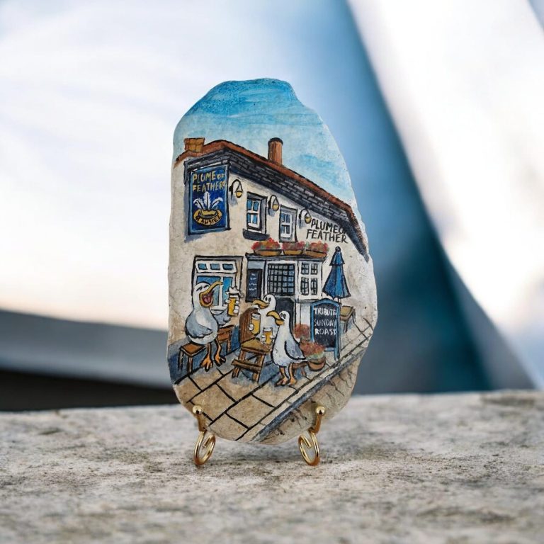 And every time I look down, I ask myself the same question: why do no birds ever go there? It’s called The Plume of Feathers. Feathers! That’s us! That’s me! That’s Nigel and Susan and every gull from here to St Mawes. Humans don’t even have feathers. Not one. Not even a decorative plume. And yet they sit inside, sipping Tribute, nibbling crab‑flavoured crisps, and pretending they understand the majesty of moulting.